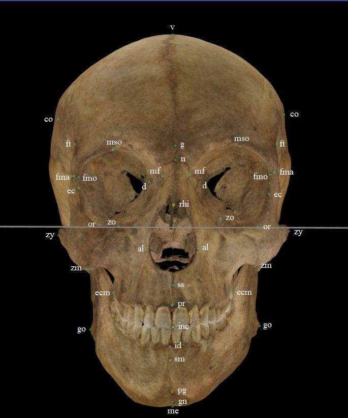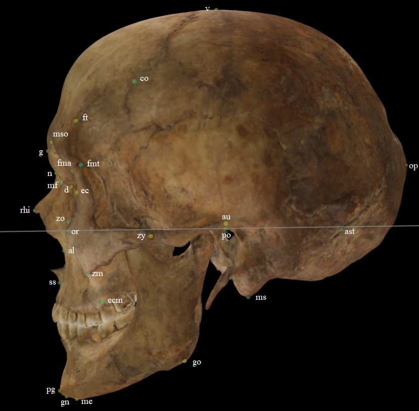 Fig. 1. Craniometric landmarks on a skull 3D model in frontal/lateral view.